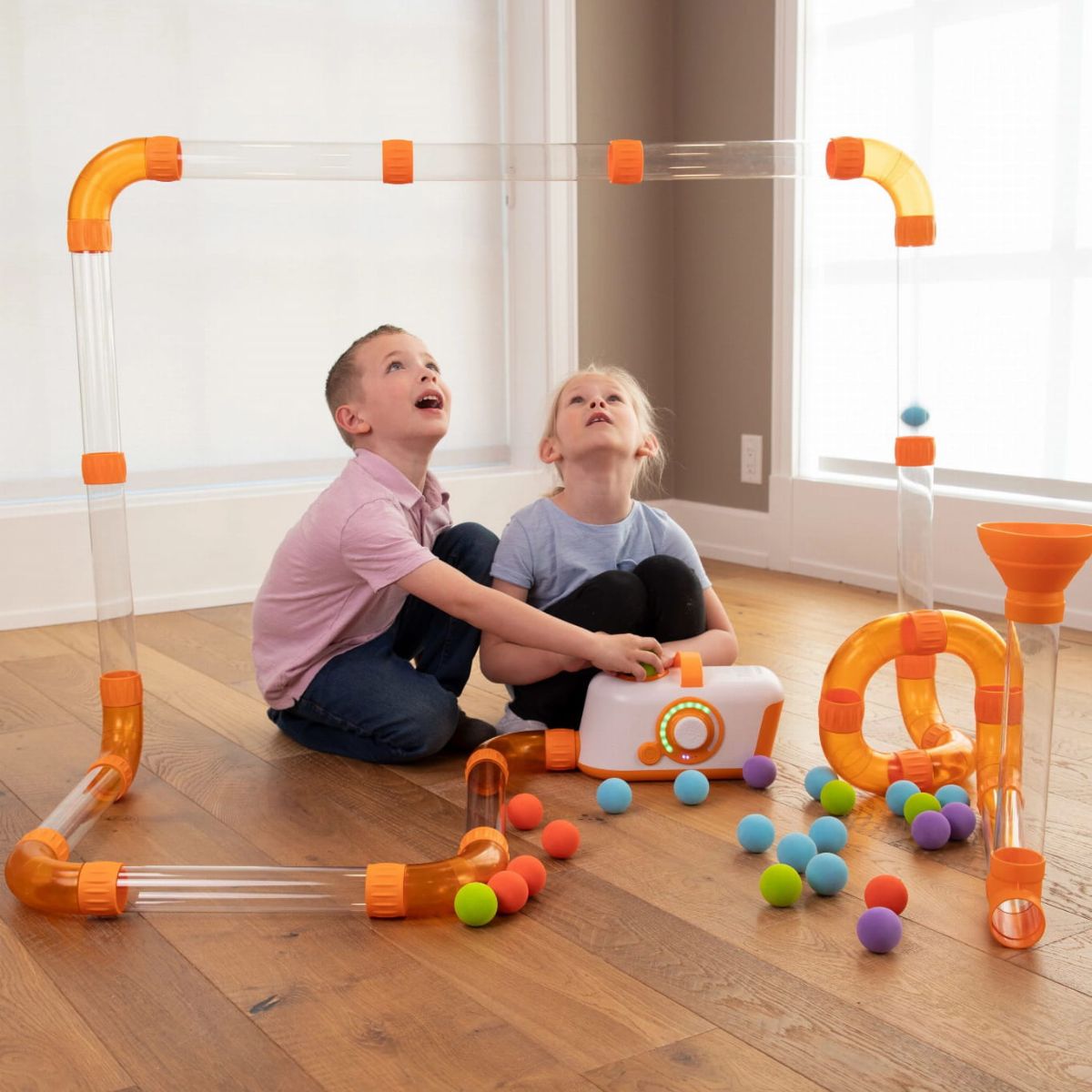 - Skutečné STEM učení: Fyzika na dosah ruky! Experimentujte společně s různými stupni foukání a sledujte, jak míčky sviští novými zatáčkami.